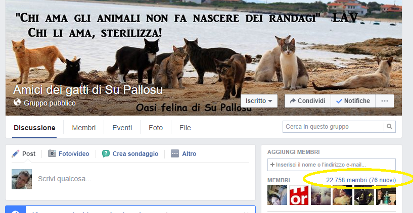 Tra i gruppi facebook infatti stacca tutti e alla grande, il gruppo Amici dei gatti di Su Pallosu che ha superato la rilevantissima, impressionante quota di 22.000 (ventiduemila) iscritti e vola verso il tetto dei 23mila.