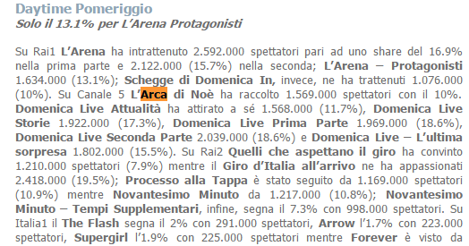 Questo il rilevante dato del’Auditel registrato per “L’Arca di Noè “, uno dei principali programmi televisivi nazionali dedicato interamente agli animali, che ha battuto il programma Rai “Schegge di Domenica In”, in onda nello stesso momento sulla tv di stato.