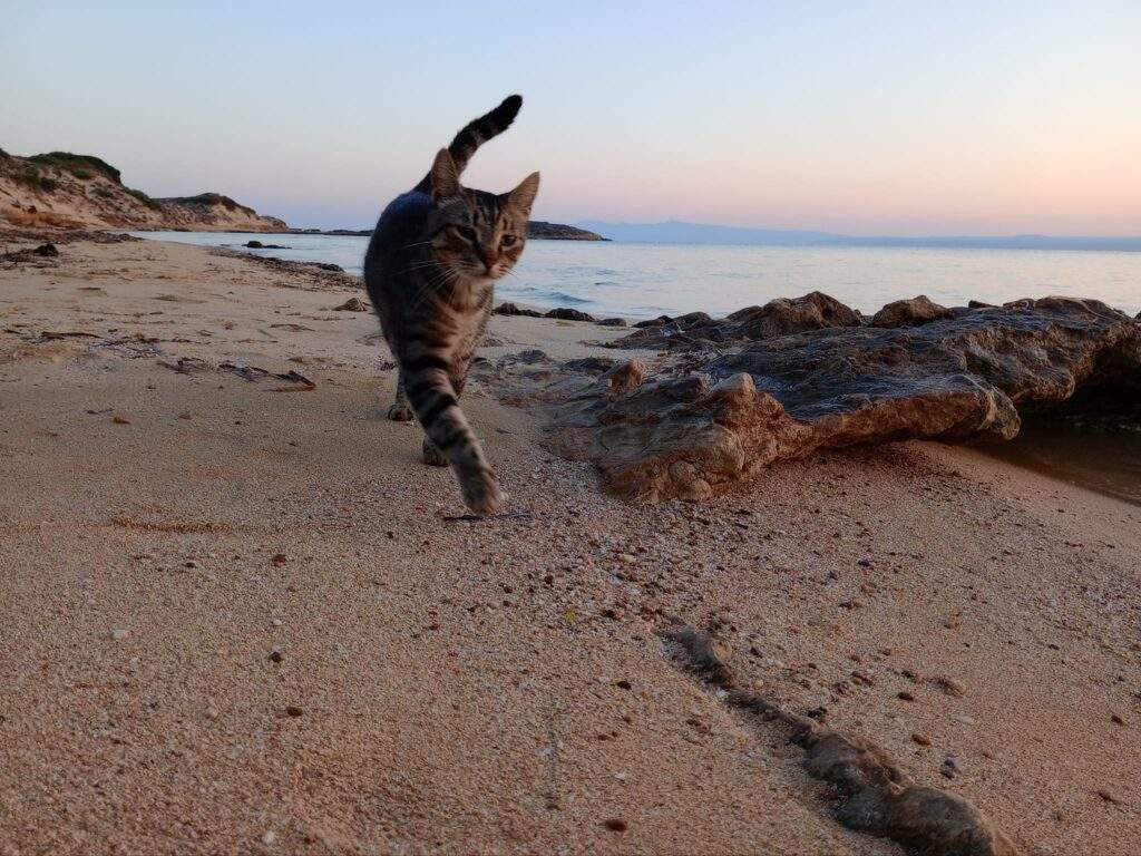 Viceversa in alta stagione, agosto, fine settimana, festivi, nelle ore calde o quando la spiaggia è affollata, è ovviamente del tutto escluso o improbabile vedere un gatto in spiaggia.