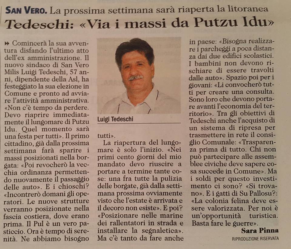 Prima intervista del neo sindaco Tedeschi e prime dichiarazioni ufficiali per la valorizzazione dei gatti di Su Pallosu.L'Unione Sarda del 3 giugno2015.