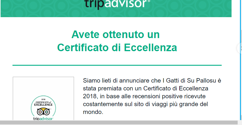 I Gatti di Su Pallosu hanno fatto tris.Per il terzo anno consecutivo 2016, 2017 e ora 2018, l’Oasi Felina Privata di Su Pallosu ha ricevuto il Certificato di Eccellenza quale Attrazione Turistica dal Portale Internazionale Tripadvisor.