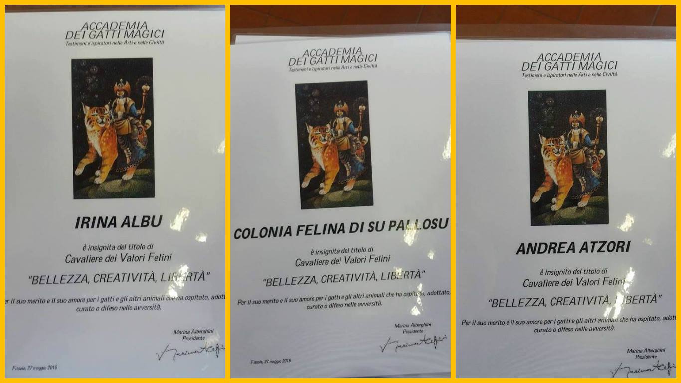 L’ “Accademia dei Gatti Magici” ha infatti insignito ieri-fra gli altri- del titolo di “Cavalieri dei Valori Felini” anche i gattari Andrea Atzori e Irina Albu, gestori della colonia felina di Su Pallosu, in Sardegna.