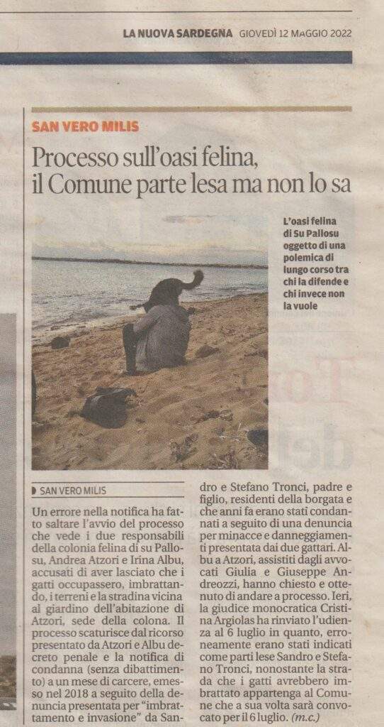 Il processo entrerà nel vivo il 6 febbraio 2023, con i testimoni dell’accusa, i querelanti, privati che non hanno mai nascosto antipatie verso i gatti di Su Pallosu. Una componente dello stesso nucleo familiare dei querelanti si è resa protagonista di vari episodi di tentativi di boicottaggio dell’oasi felina (e delle visite) da tempo noti su tripadvisor e sui social.