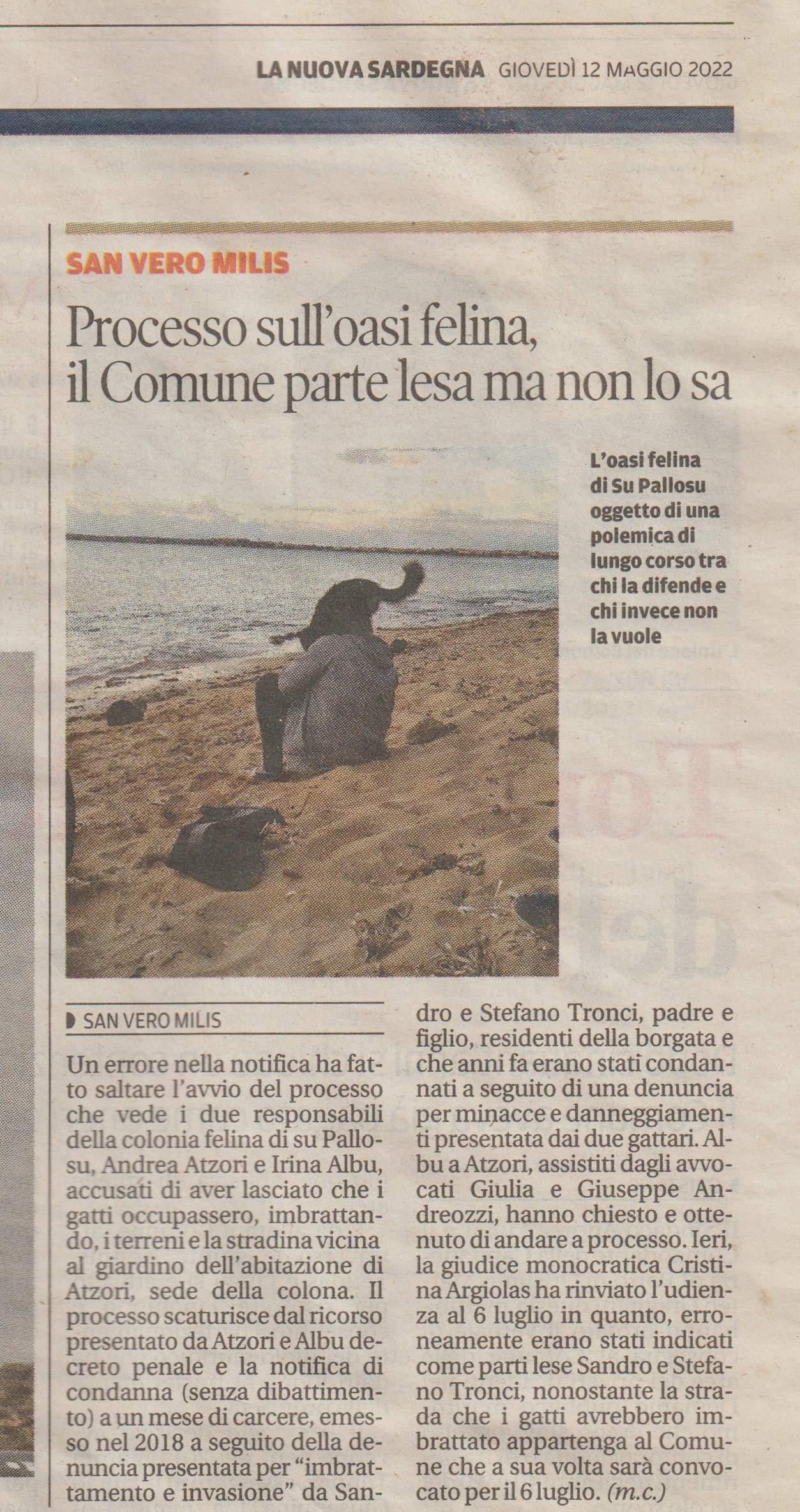 Il giudice Cristiana Argiolas ha preso atto della regolare notifica al comune che ha rinunciato alla facoltà di costituirsi parte civile contro i gattari. Nell’ udienza del maggio scorso i privati querelanti erano stati erroneamente indicati quale parte lesa per fatti relativi ad una stradina (unico accesso dell’Oasi Felina) che è risultata però essere di proprietà comunale e non di privati. Per questo era stata decisa la notifica di parte lesa all’amministrazione comunale, che aveva la facoltà di nominare un proprio avvocato. Nessun legale era presente oggi in aula per il comune di San Vero e verificata la regolarità della notifica da parte del giudice Argiolars, il processo andrà avanti ora esclusivamente con l’accusa del Pubblico Ministero.