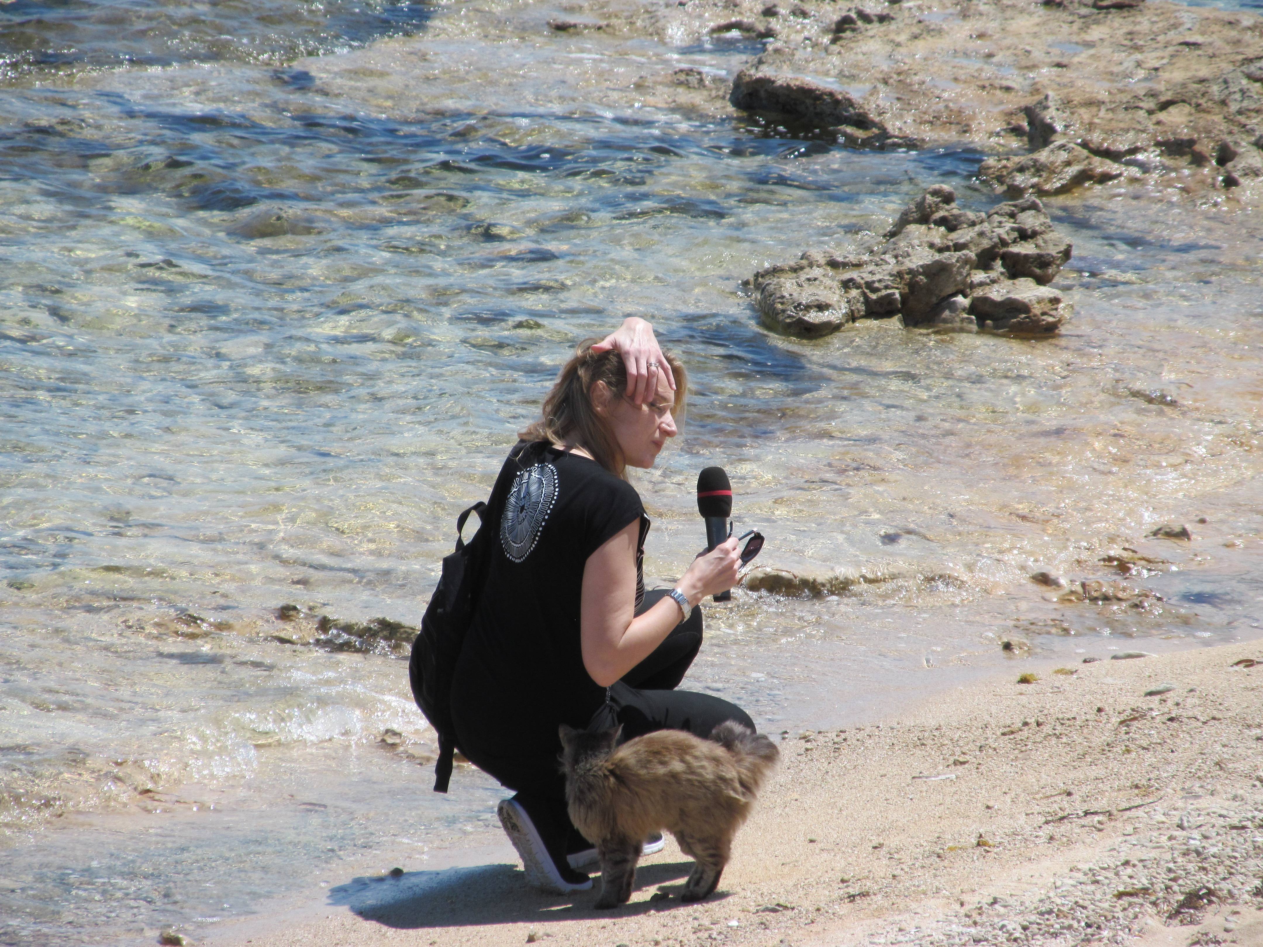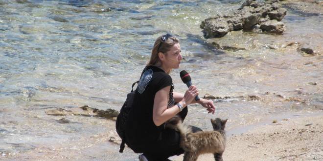 La giornalista Sabrina Pieragostini sulla spiaggia di Su Pallosu, sulla destra due gatti dell’Oasi Felina: Cicciobello e Cieco