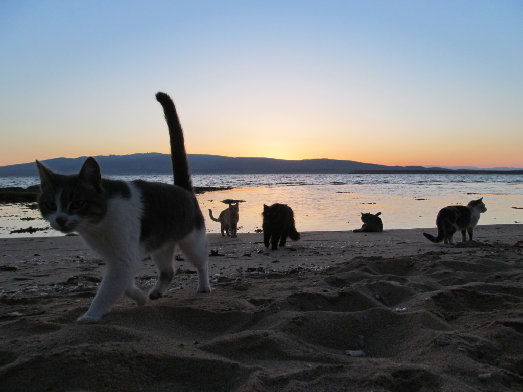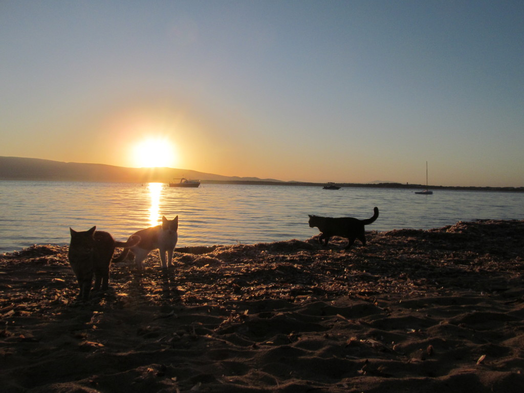 Il sole che sorge lento dal Montiferru e illumina il mare riflettendosi su di esso; le sagome di diversi gatti sulla spiaggia a due passi dal mare, pian piano visibili.