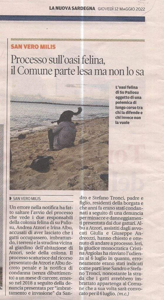 Un grazie di cuore va ai nostri avvocati di fiducia Giuseppe e Giulia Andreozzi del foro di Cagliari, esperti nel campo del diritto ambientale-animale e a tutti gli amici dei gatti di Su Pallosu, che ci sono stati sempre vicini in tutti questi anni.