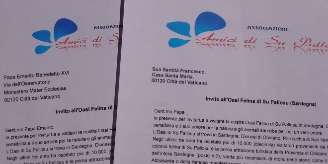 Facendo seguito al nostro tweet abbiamo successivamente inviato formale missiva ai due Papi Francesco e Benedetto, contenente invito a visitare Oasi Felina di Su Pallosu.