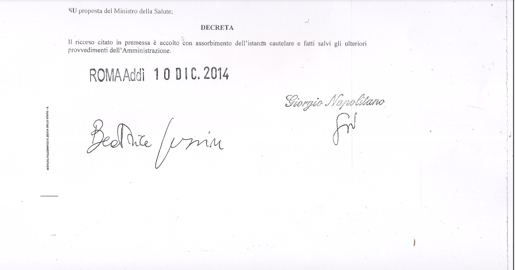 Il 10 dicembre del 2014 il Capo dello Stato firmo’ apposito Decreto Presidenziale (DPR) che accolse il nostro ricorso, in seguito al Parere del Consiglio di Stato emesso nell’adunanza del 27 agosto 2014.