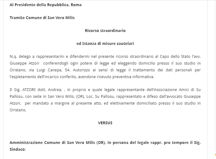Il 14 agosto del 2013 nella qualità di Presidente e Legale Rappresentante dell’ Associazione culturale Amici di Su Pallosu, attraverso l’avvocato Giuseppe Atzori, Andrea Atzori ha presentato un Ricorso Straordinario al Capo dello Stato, per chiedere l’annullamento della Delibera del Consiglio Comunale di San Vero Milis del 21 marzo 2013 che bocciò la richiesta di riconoscimento della colonia felina di Su Pallosu.