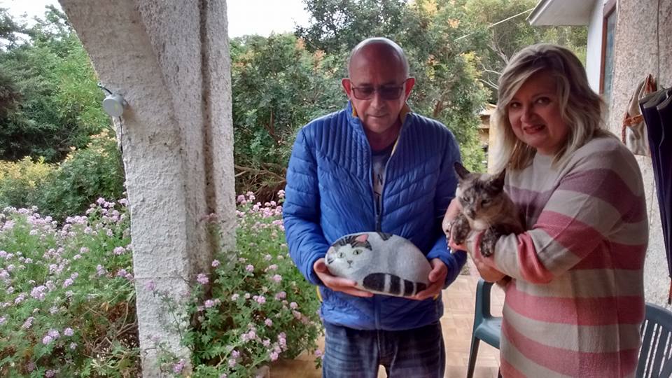 Aziza-una delle gatte simbolo di Su Pallosu- e Irina Albu, mamma gattara dell’Oasi marina- hanno consegnato oggi ai Tati Antonello Abis e Michela Cuccu un omaggio ricordo in onore di Rocco: un sasso interamente dipinto a mano dall’artista amante dei gatti Irina Albu, con il volto dello stesso Rocco, mascotte del Museo del Grano di Ortacesus, .