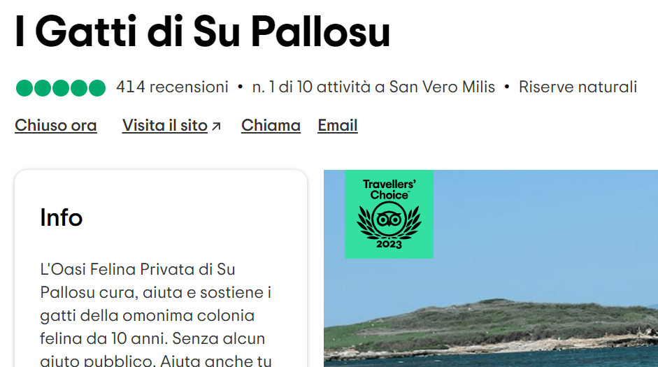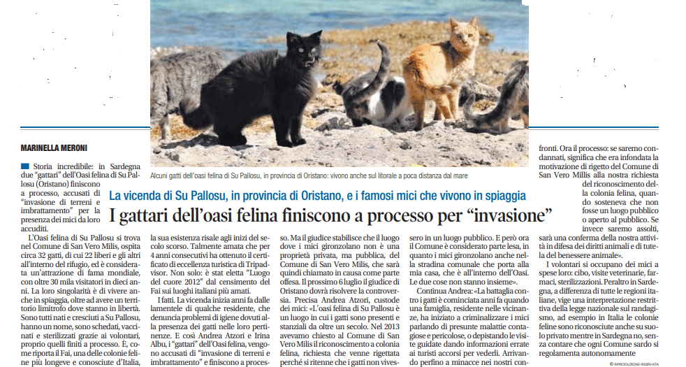 Un primato che fa notizia.Il primo posto della Colonia Felina di Su Pallosu tra le attrazioni turistiche della provincia di Oristano, nella classifica del noto portale internazionale di viaggi e turismo, Tripadvisor, difficilmente poteva passare inosservato.E non pochi media  che hanno ripreso la notizia.L’Unione Sarda, quotidiano regionale cagliaritano, l’ha fatto evidenziando nel suo titolo : “I gatti battono i Giganti”. …