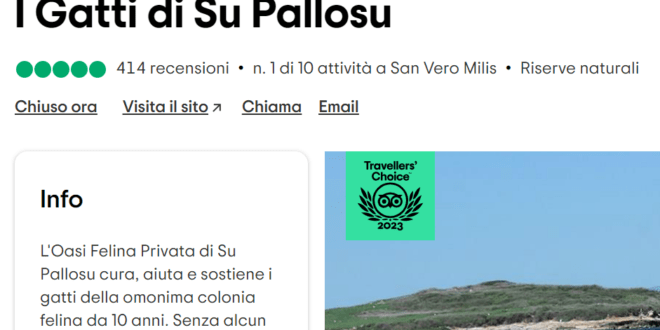 E’ arrivato infatti oggi, 20 giugno 2023, da Tripadvisor con il Premio Traveller’Choice, attraverso la pubblicazione ufficiale del logo nella nostra pagina sul mega portale di viaggi https://www.tripadvisor.it/Attraction_Review-g1238433-d7088002-Reviews-I_Gatti_di_Su_Pallosu-San_Vero_Milis_Province_of_Oristano_Sardinia.html