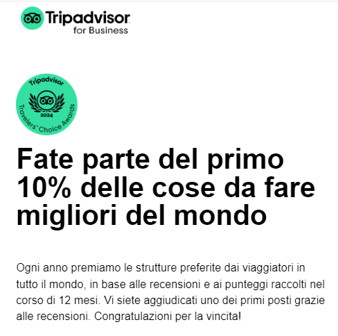 Dopo 4 certificati d’eccellenza turistica e un Travellers’ Choice ottenuti negli anni passati, ancora una conferma attraverso un enorme riconoscimento che arriva direttamente dai nostri visitatori attraverso le loro entusiaste recensioni sul portale di viaggi più importante al mondo.