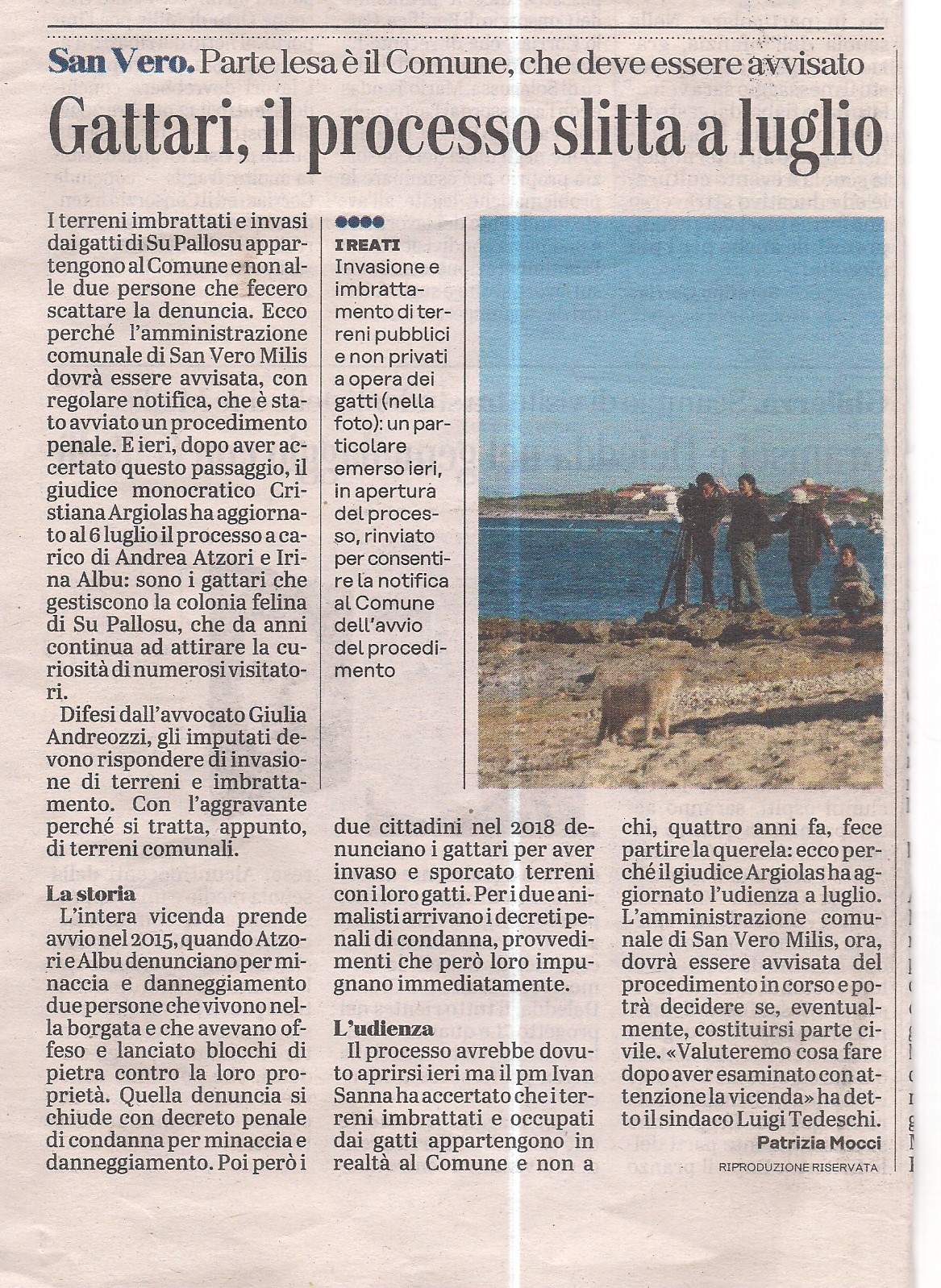 Una sola precisazione rispetto al testo del quotidiano di Cagliari. Ai gattari non è imputato alcun reato di natura igienico sanitaria,
