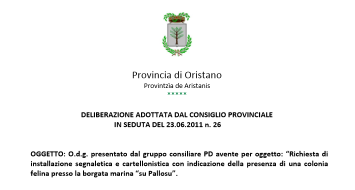 all’installazione di apposita segnaletica indicatoria, turistica e di pericolo anche attraverso l’apposizione di tre cartelli triangolari con disegno del gatto, così come realizzato da numerose amministrazioni locali (esattamente così come già previsto dalla Delibera approvata unanimemente dal Consiglio Provinciale di Oristano del n. 26 del 23 giugno 2011);