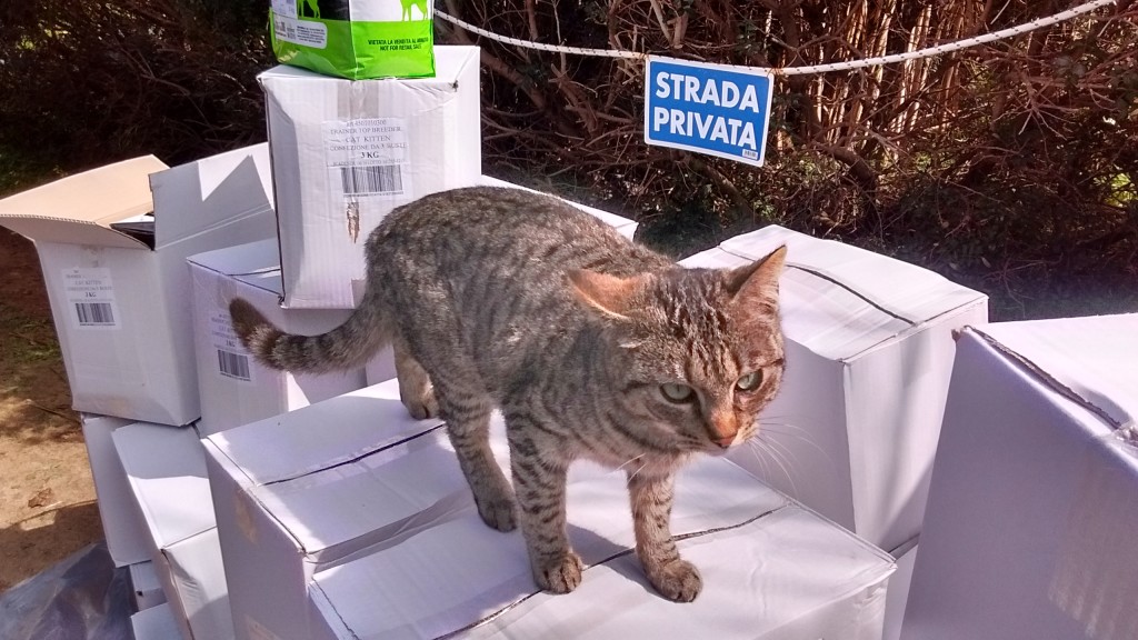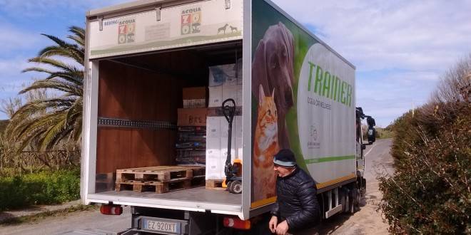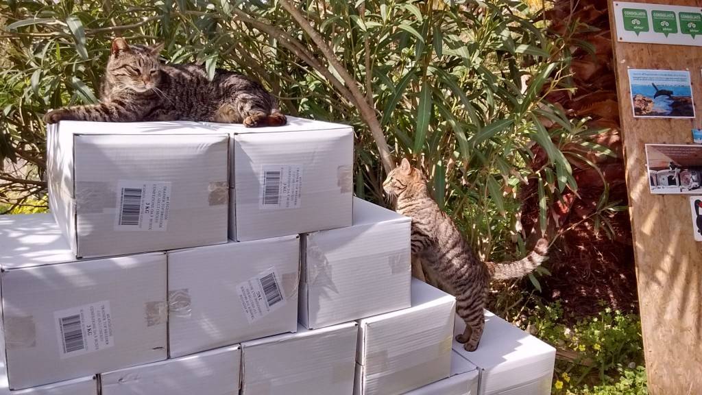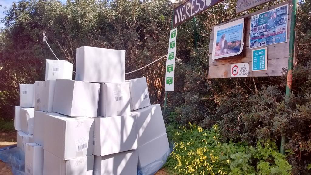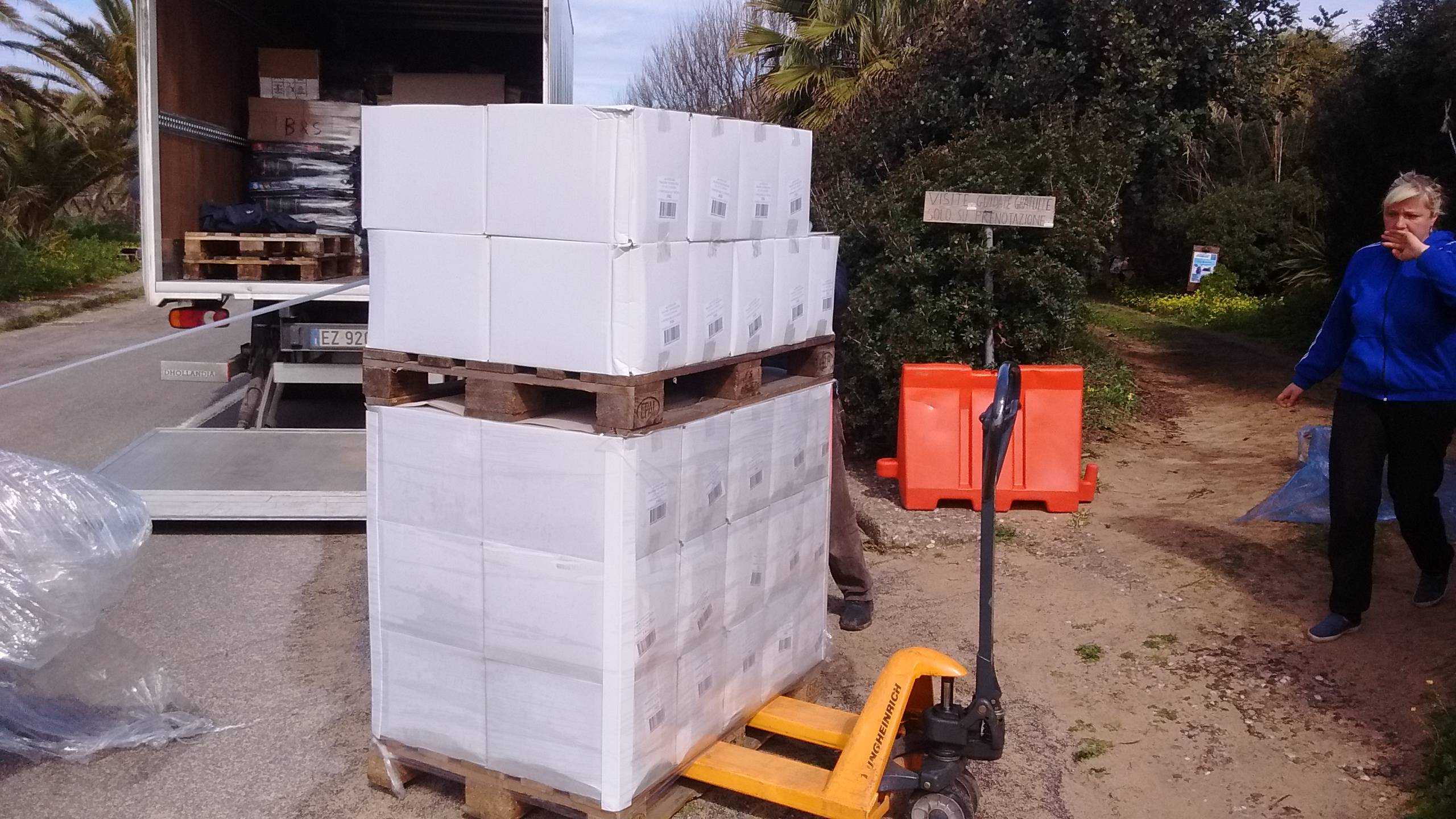 Quasi 500 chili per i gatti “marini”.Il carico è arrivato questa mattina alle 11 a Su Pallosu: 2 pedane, 50 scatole, contenente ognuna tre buste di 3 kg ciascuna.