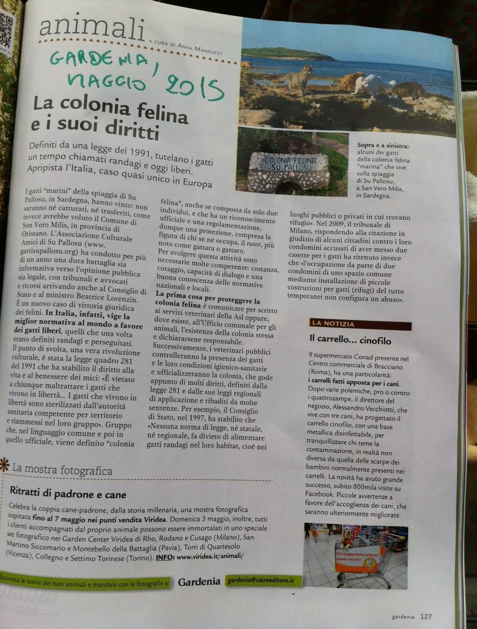 E’ un prestigioso mensile dedicato al giardinaggio e alla cultura verde, con ben 100 mila copie di tiratura e 20 mila abbonamenti. Una rivista molto letta in Italia.Si chiama GARDENIA, nel numero in edicola, mese di maggio 2015, dedica ampio spazio, pag-127, all’Oasi Felina di Su Pallosu e in particolare ai risvolti giuridici del nostro caso in relazione alla legislazione sulle colonie feline.Se vi va compratela.