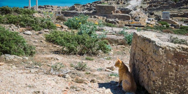Nelle belle foto del pescatore appassionato di fotografia e animali di Cabras, Silvio Piscedda, vediamo “Cecio”, questo il suo nome affibbiato dalla guida locale, un gatto rosso perfettamente a proprio agio nelle splendide rovine storiche della città punico fenicia.