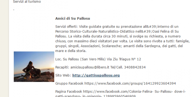 Uniamo benessere animale e valorizzazione del territorio.Un’idea semplice,pazza per alcuni, che in questi anni grazie ai Gatti di Su Pallosu ha portato una località sconosciuta fino a qualche decennio fa nel mondo a rappresentare la Sardegna e l’Italia a livello internazionale.