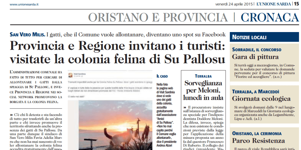 Testo dell’articolo dell’Unione Sarda del 24 aprile 2015 sulla realtà del Turismo Felino di Su Pallosu