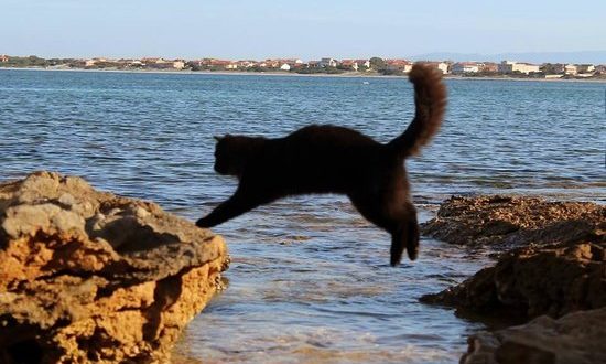 Non solo Ciupa ama saltare da roccia a rocca sopra il mare, anche i colleghi dell’Oasi Felina Paul, Cieco, Aziza e Piciulon (il gatto maschio bianco e grigio della foto qua sopra) si sono più volte esibiti mostrando grande agilità e plascità nei movimenti.